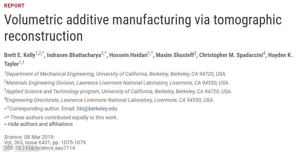 2019年3月8日加利福尼亚大学伯克利分校Hayden K. Taylor团队开发出高速“容积3D打印技术”,只要光照几十秒,完美雕像浮出水面。相关论文以“Volumetric additive manufacturing via tomographic reconstruction”为题目发表在《Science》上。