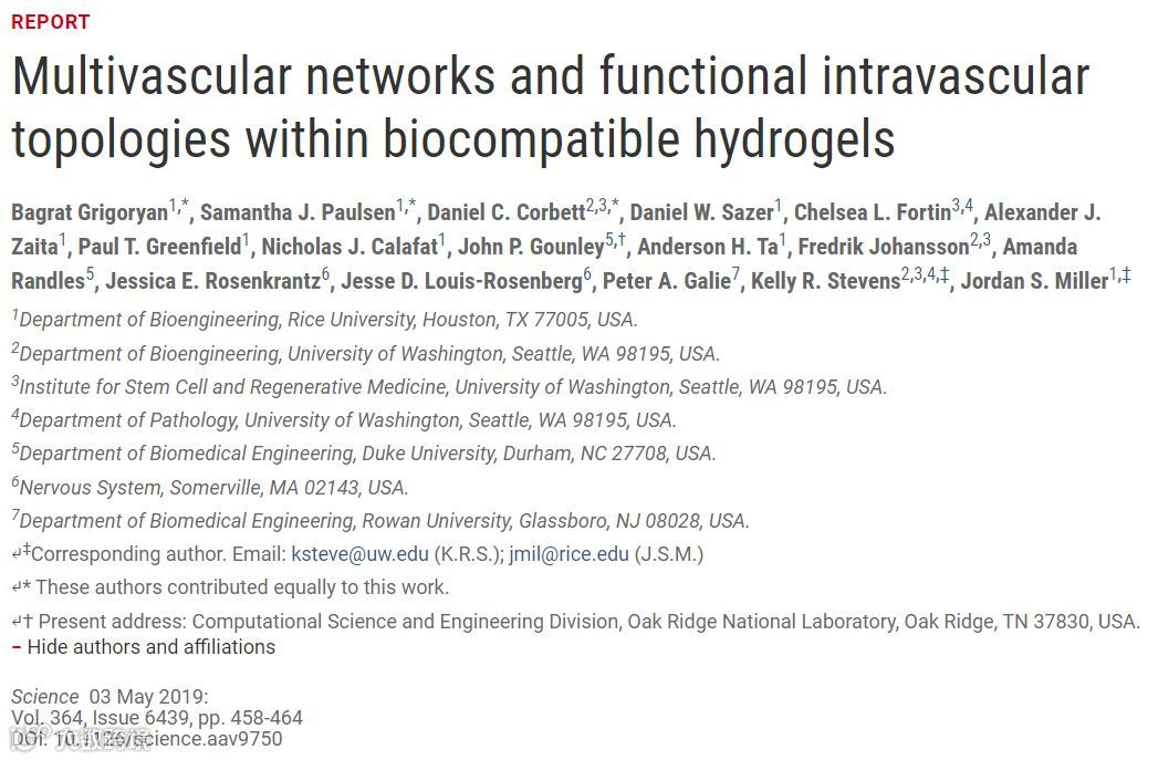 2019年5月3日,美国莱斯大学Jordan S. Miller与华盛顿大学Kelly R. Stevens合作,利用投影立体光刻(projection stereolithography)3D打印技术,以食品染料添加剂作为生物相容的光吸收剂,只需数分钟就可在透明光聚合水凝胶中制备具有3D内部功能结构的血管系统,可在血管内实现混合功能和二尖瓣功能。他们基于空间填充数学拓扑设计并制备了互相缠绕的血管网络,并模拟肺泡结构实现了流动人类血液中红细胞的氧气交换。此外,他们还以这种具备血管网络的可生物降解水凝胶为肝细胞的组织工程载体,并在慢性肝损伤的小鼠模型中证实了这种血管系统很有希望用于人工器官的构建。相关论文以“Multivascular networks and functional intravascular topologies within biocompatible hydrogels”为题,发表在《Science》上,并被选为当期封面。