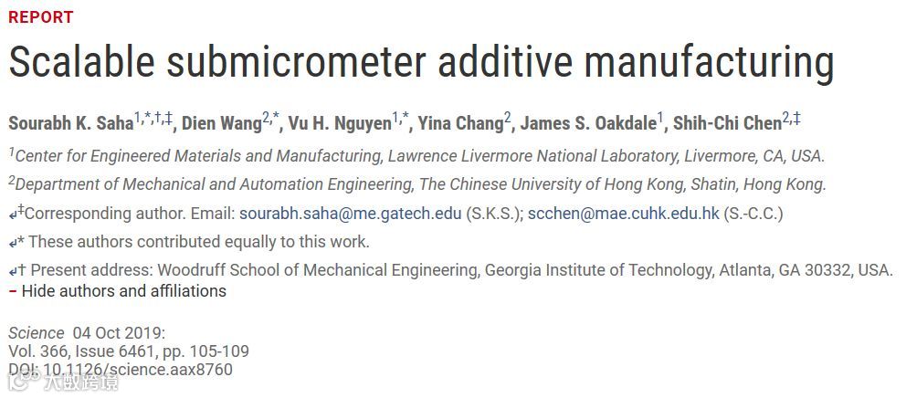 基于双光子光刻(TPL)的亚微米增材制造技术有望实现量产制备具有纳米尺度的复杂三维结构。然而,对于工业应用而言,TPL的连续逐点扫描速度太慢。同时使用多个单光电无法达到亚微米分辨率,或者无法模拟复杂的结构。美国加州劳伦斯利弗莫尔国家实验室Sourabh K. Saha和香港中文大学Shih-Chi Chen合作提出一种通过超快激光打印亚微米结构的技术。通过投影2D聚焦平面构筑3D模型。这种方法在不牺牲分辨率的情况下将传统方法的产率提高了三个数量级。能够在8分钟的时间内打印出传统TPL方法几个小时才能完成的结构。相关论文以Scalable submicrometer additive manufacturing为题发表在《Science》上。