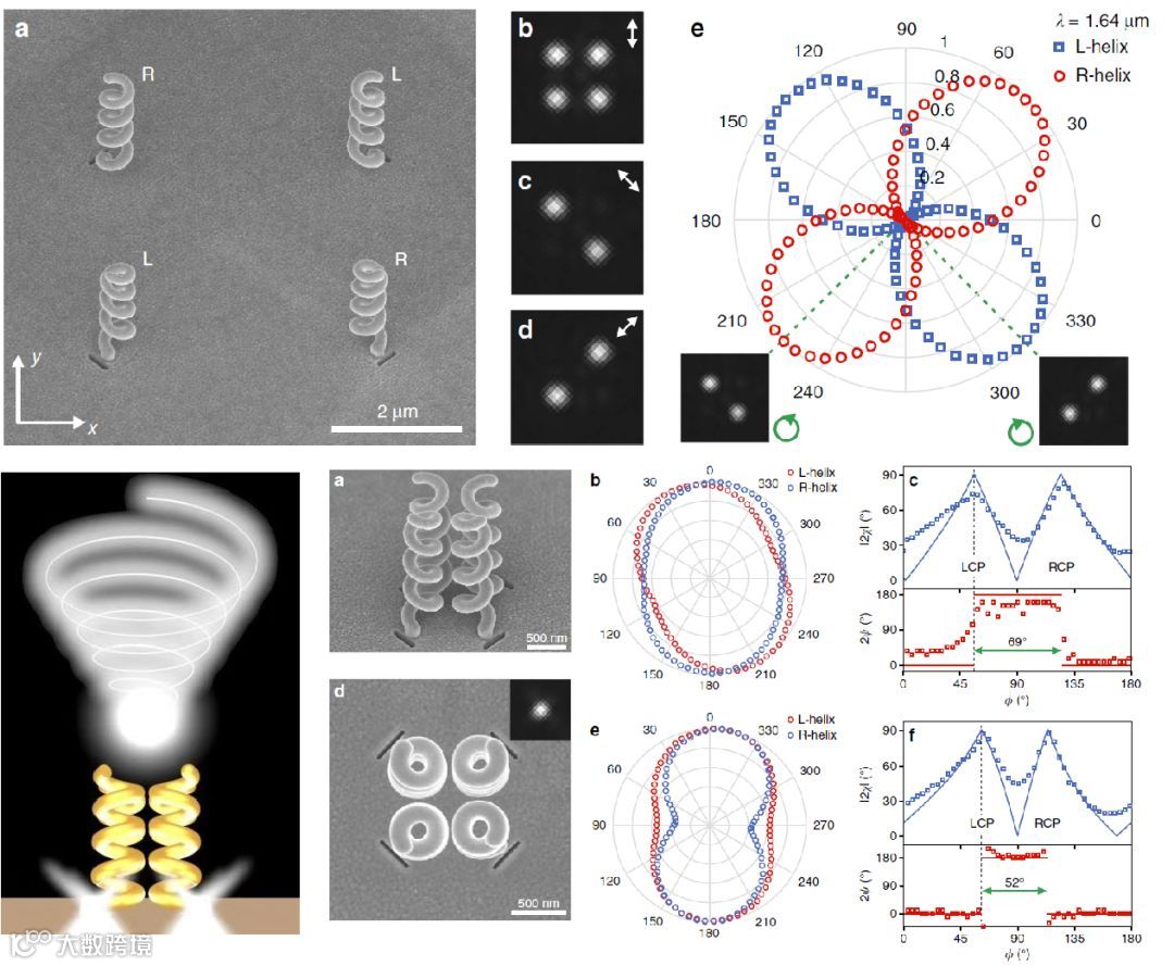 研究提出了一种等离子体式的螺旋行波纳米天线,它通过镀金螺旋碳纳米线与偶极子孔径纳米天线来构成,实现非共振螺旋纳米天线在亚波长尺度上旋转表面等离子体并利用光学自旋-轨道相互作用实现可调谐的偏振控制。通过近场耦合四个相反方向的螺旋纳米天线,证明了一种亚波长的波片式(waveplate-like)结构,在偏振控制方面提供了一种普通偏振光学和目前超材料无法实现的自由度。其超紧凑的器件结构(小于工作波长尺寸)在显示、单像素光偏振操控、数据存储、显微和传感方面具有较大的潜在应用。