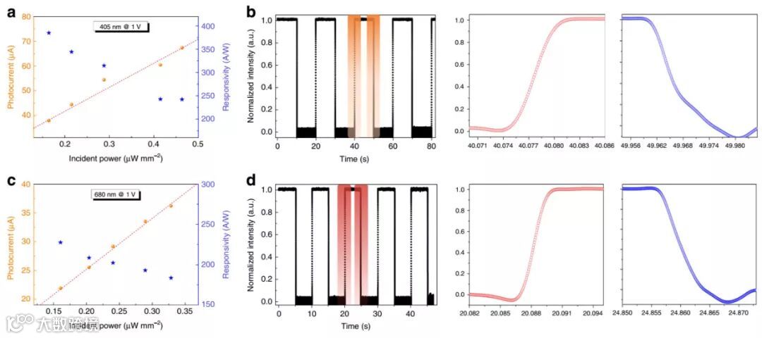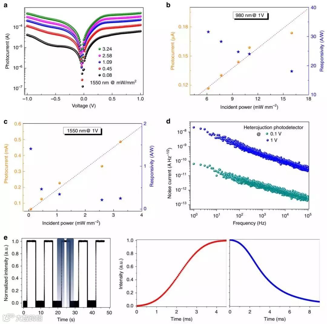 研究人员详细研究了该器件从可见光到近红外光谱范围的光子响应特性。在1550 nm的光纤通信波长时,异质结器件的最高响应率为1.4 A/W。由于采用了一种抗反射钙钛矿涂层,该涂层在通信波段的厚度为150 nm,从而提高了性能。此外,在680 nm的可见光波长下,该器件的响应度和探测率分别为228 A/W和1.6×1010 Jones。这些优异的性能归功于异质结构器件中光导增益的提高。该团队提出的异质结光电探测器为从可见光到光通信领域的广谱光检测提供了一种强有力的检测方法。基于其优异的可见光到近红外光谱的光探测和捕获能力,设计的锗/钙钛矿异质结构为新型光电器件提供了新的构件。其高性能在广谱光检测、紫外-可见或光通信、串联太阳能电池和下一代光电器件等领域具有巨大的应用潜力。