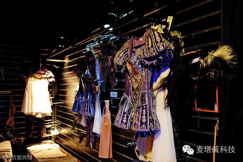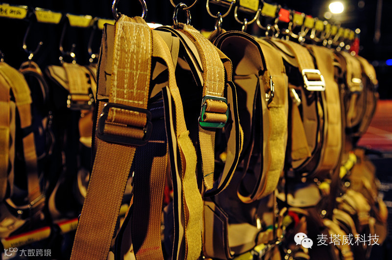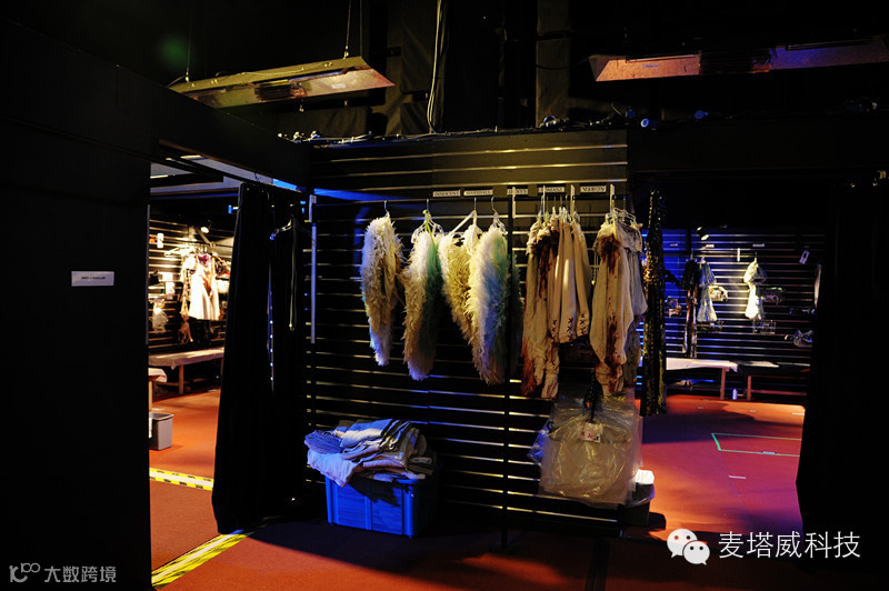 如果说地下层多是潜水员出场的位置,那这高高在上,360度环形的空中剧场,是是汇演另一个心脏地带。就是一众演员从高空用特制飞绳吊出场的地方,为此,这里专门设有演员的化装间。化妆间的陈设,分门别类,排列整齐。最上层是名片标签,显示衣物的主人姓名。然后是饰物,被挂在架子上的小箱子里。中间是演出服装。眼前的防水衣,重2-3公斤,是以潜水衣用料氯丁橡胶制成,具有极佳的防水功效。下面摆放着相连的长木椅,椅子上是整齐的白毛巾。据说每一场演出,剧场要准备700条大毛巾,以备演员使用。