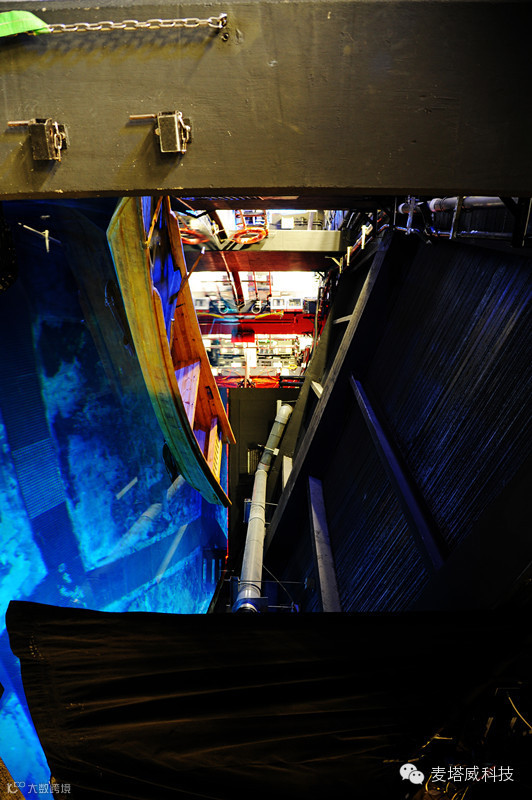 围绕着圆形的地下层,我们可以从各个出口处,透视舞台中央的场景。一艘高大的西式航船,正在检验各种机件是否正常——升起、降落、折叠,这样的程式,是每日开演前的必备,马虎不得。大船通过油压系统,被引导到达中央的位置。出场之前,大船可以折叠收起,长约6米,藏在7米之深的水池下面待用。