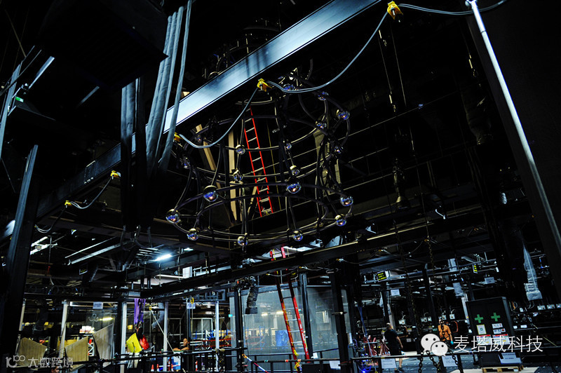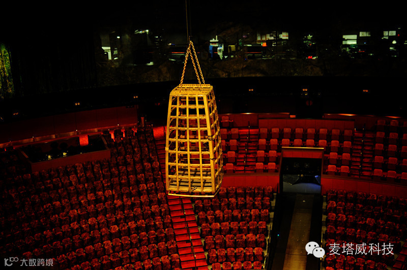 当你在观众席,抬头往剧院顶部看去,空中舞台呈360度,这里距离舞台36米,约12层楼高。由于离舞台距离很远,细微的物品掉下去,都会伤及物品及人。所以,剧场用钢筋铁架之外,还用细黑沙网铺满地板。走在黑色钢枝和细沙网上,脚步迈得很特别,既有腾空的感觉,又充满谨慎。