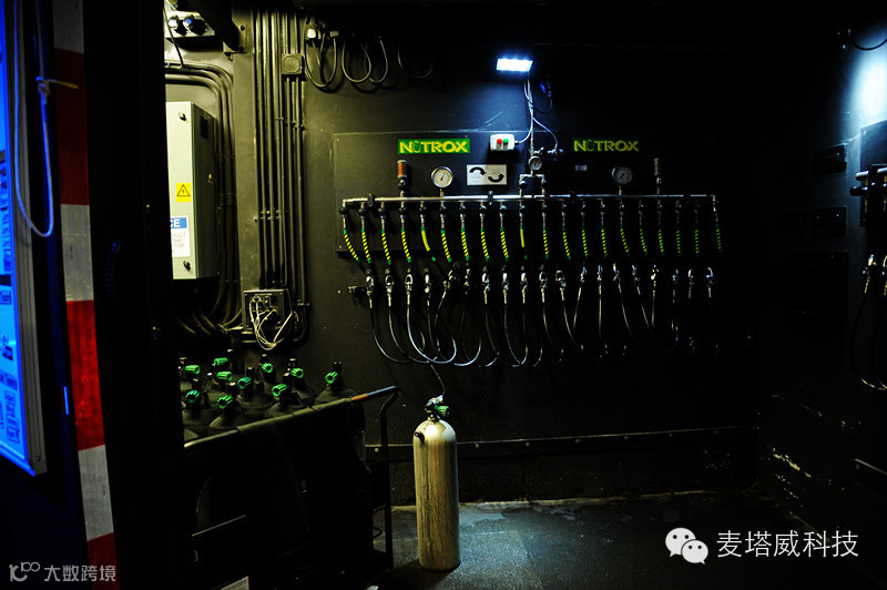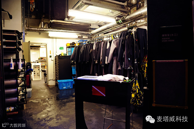 经过一个小房间,来到演员的演出装备放置处,可以看到井然有序的氧气筒、潜水服放置着,水舞间的每一次表演,潜水员要沉在水底一个半钟,每日两场,加上平日训练时间,演员每天潜水的时间就达3至5小时。为了潜水员健康着想,氧气桶里放置的不单是氧气,还有一些氧气和氮气的混合,以保障潜水员的健康和安全。