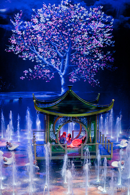 色彩缤纷的升降舞台,有很多个小孔,舞台内置约239个独立喷水口,喷泉水柱高度可达约18米。水就很容易从小孔中退却,水池内更设有11部重型升降台,升降舞台原本藏在水池的底部。两侧的浮板升到离水1米高的位置。接着,中间那块浮板继续上升,拼合成一块完整的舞台。只要75秒,便可以将水池变回干爽的舞台,神奇程度可谓震撼每位观众。事实上,它可以升得更快,但是,为了不涧出更多水花,必须控制在75秒完成。由于运用油压系统在舞台机械上,舞台可以承受电单车乃至汽车在上面飞驰的重量。