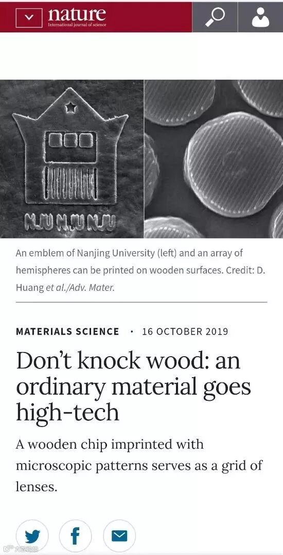 Nature以“别再挑剔木材:它已经走入高科技(Don’t knock wood: an ordinary material goes high-tech)”进行了“Highlight”:“中国南京大学的祝名伟、马里兰大学的胡良兵及其同事将压印技术应用于木纤维,所得材料可以作为塑料的丰富替代品,如印有微观图案的木片可以用作微透镜阵列”。