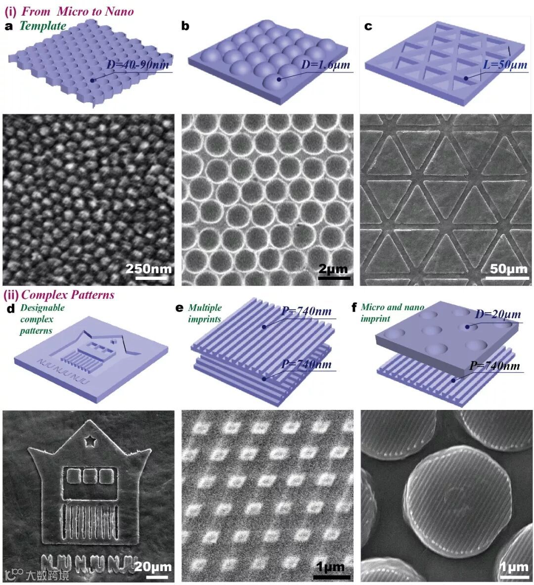 a)大小为40~ 90 nm的纳米点的表面图案;b)表面直径1.6μm 微米凹球图案;c)三角形边长50μm的浮雕;d)NJU标志在木材表面的图案;e) 2维点阵可以用一个光栅模板重复,以不同的角度在木板上刻印两次获得;f)表面有纳米光栅的微尺度半球的多尺度复合结构也可以通过双重压印来实现。