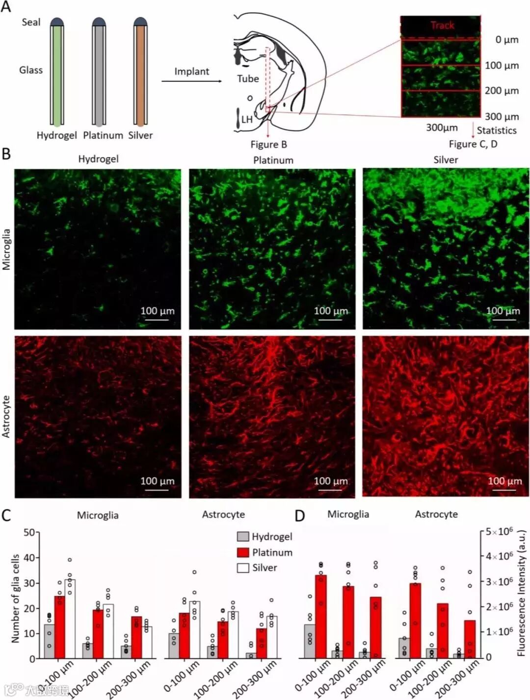 接下来确认PEG-ACSF水凝胶比金属的免疫排斥反应少得多。将水凝胶,银和铂放入玻璃管中。每个管的一端都是密封的,另一端是打开的。将每根管子植入小鼠大脑的外侧下丘脑(LH)。一周后,在管子开口端下方切片,免疫化学处理切片,并在共聚焦显微镜观察它们。铂引起的免疫化学反应比银少。水凝胶引起的免疫化学反应比铂少得多。使用水凝胶测试的切片中的胶质细胞数量明显少于使用金属的切片。使用水凝胶测试的切片的荧光强度也远低于使用铂的切片。