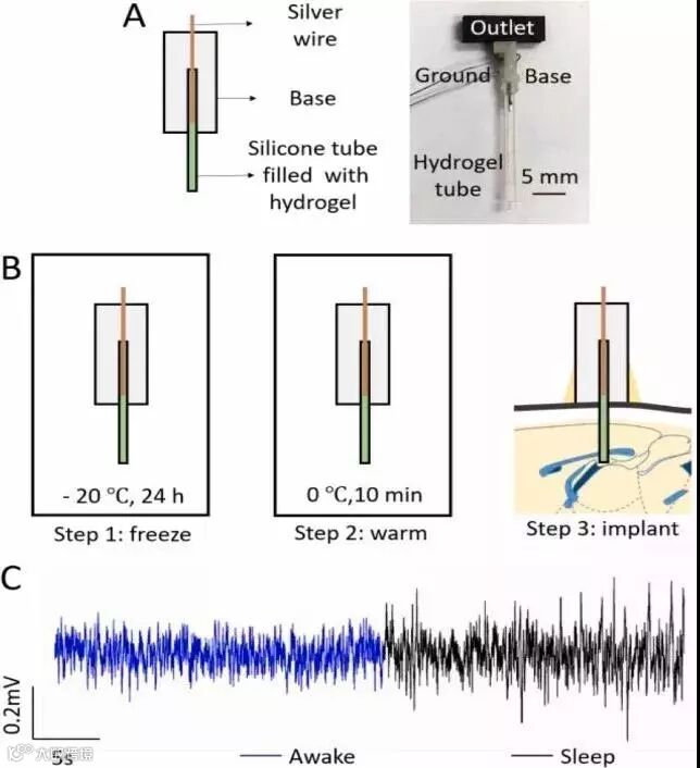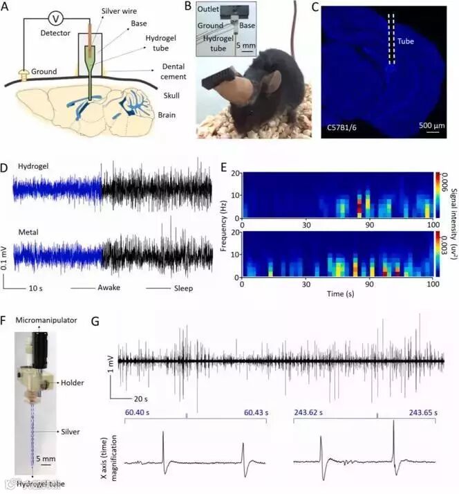 接下来使用水凝胶记录体内自由移动小鼠的局部场电位。将神经接口设计为帽。盖子容纳了一个填充水凝胶的玻璃管,将其植入自由移动的小鼠的海马体。记录的信号清楚地区分了小鼠的两种状态,即唤醒和睡眠。并且水凝胶记录的信号与铂记录的信号相当。