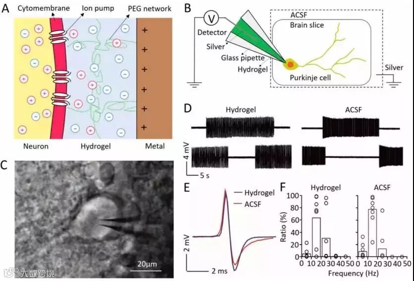 为了说明水凝胶神经电子接口的基本物理和化学,考虑水凝胶如何将神经元的动作电位转换为检测器中的电子电流。水凝胶接触神经元的细胞膜和检测器的金属电极。水凝胶和神经元交换物质(即离子、水和可能的其他分子)。这种交换模拟了3种细胞外液和神经元之间的交换,在水凝胶和细胞膜之间无论有无细胞外液都是有效的。因此,PED-ACSF水凝胶在化学和电学上模拟细胞外液,但在机械上是软固体。当神经元激发动作电位时,细胞膜中的离子通道允许离子(大部分是正的)从水凝胶进入神经元。为了重新获得电中性,在水凝胶中,一些负离子向EDL迁移,而一些正离子从EDL迁移。在金属中,一些电子从EDL流向探测器。这种事件级联使检测器能够登记动作电位。