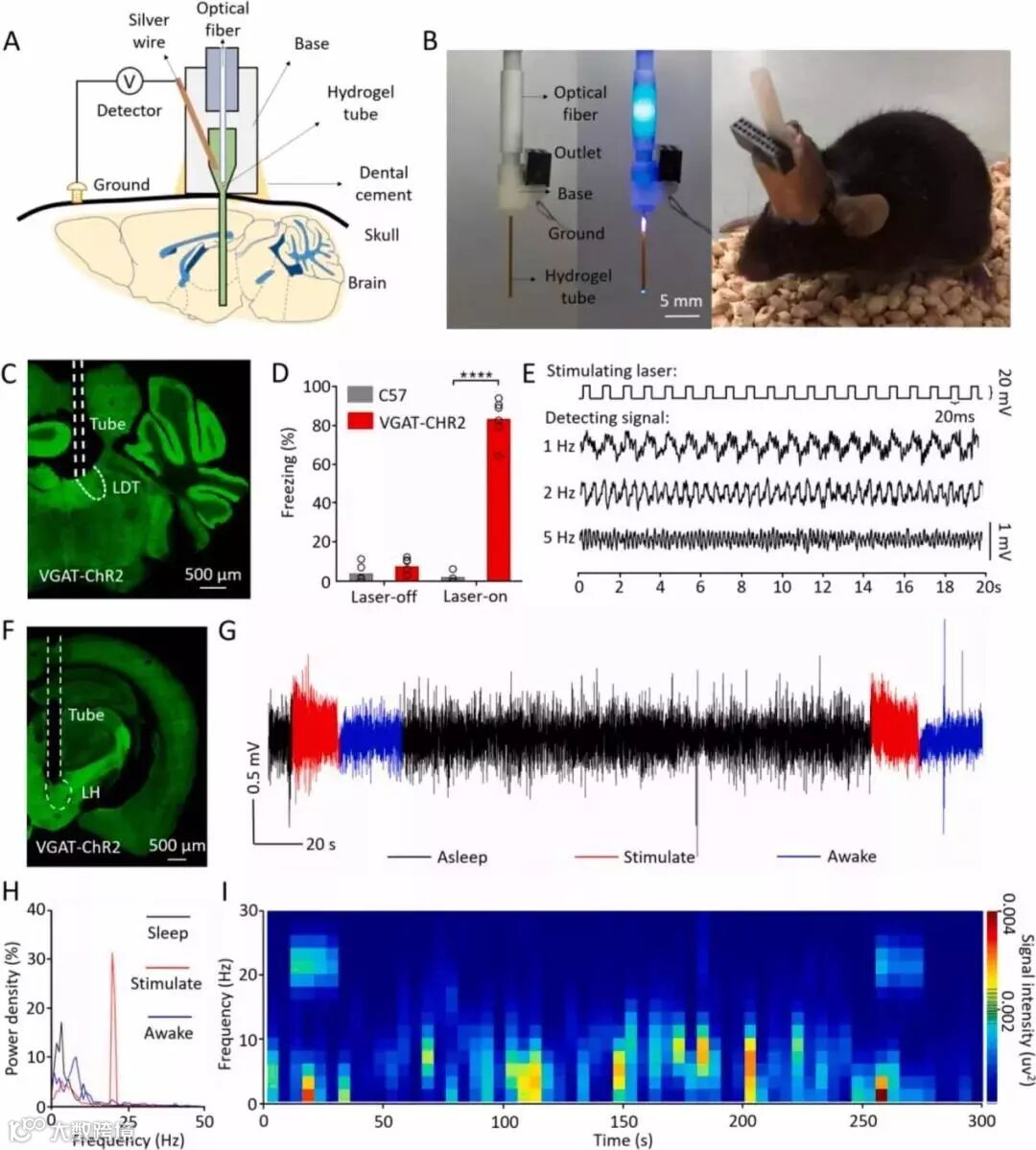 用光谱仪测量了PEG-ACSF水凝胶的透过率,其中5 mm厚的水凝胶(大约相当于小鼠大脑的厚度)在可见光范围内的平均透过率为98.4%。接下来在光遗传学实验中证实了水凝胶可以传输激光。然后证明水凝胶可以同时刺激和记录神经元。信号显示神经元随着激光脉冲的频率被激活。在小鼠入睡时选择性地刺激GABA能细胞,它们在光刺激后很快醒来。