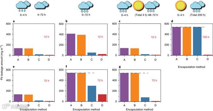 研究团队模拟了一个现实场景,在该场景中,具有不同封装方法的钙钛矿模组受到冰雹影响(改进的FM 44787标准)的力学损坏,然后定量测量各种天气条件下的Pb泄漏率。研究表明,与基于模块边缘处具有紫外线固化树脂的玻璃盖的封装方法相比,基于环氧树脂的封装方法将Pb泄漏率降低了375倍。