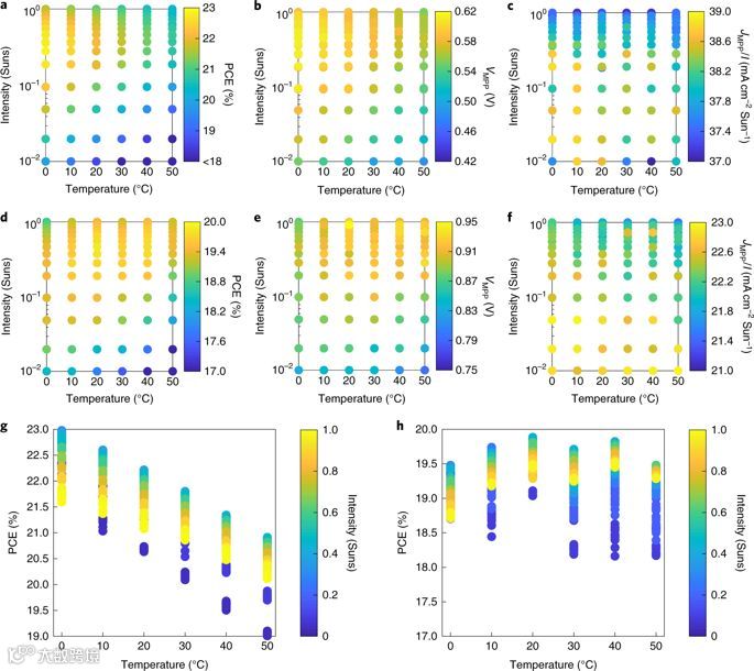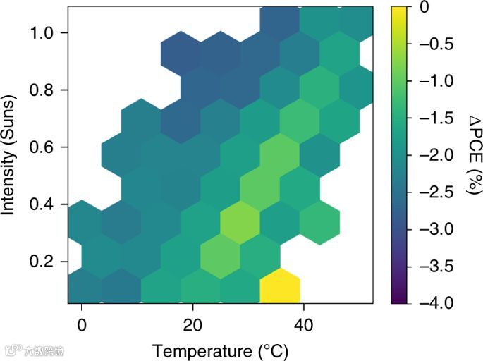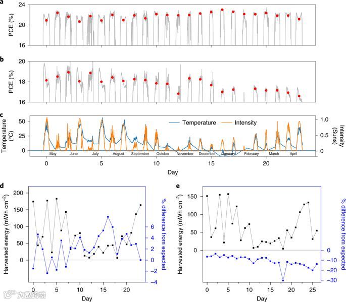研究发现,在高温度和低光强度的条件下,PSC的效率下降幅度很小,保持了几乎最佳的环境条件值,。在这种环境条件下,大部分太阳能都被转化入到太阳能电池上。但是,受可逆降解(早上提供最高性能)和一年中可观察到的轻微永久降解的影响,总能量产生量与标准测试条件测量的预期值略有不同。关于串联同时,作者还将PSC与硅器件进行了串联电池的比较。
