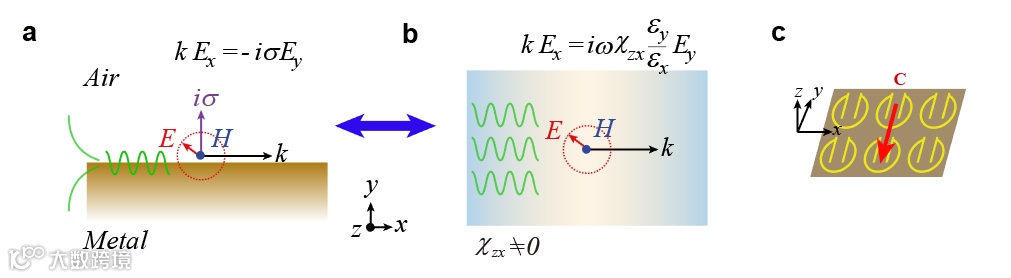 图1. a,等离子体表面态的横向自旋;b,均匀媒质中的横向自旋光子体态;c,媒质的磁电耦合性质与对称性破缺示意。