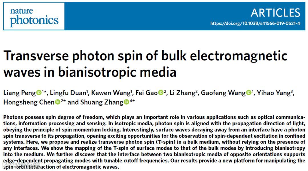 一般而言,光子在自由空间中其自旋角动量(spin angular momentum,SAM)沿着或反向其传播方向k。这是因为空间光波是横波,即k · E=0 / k · H=0,旋转的电场E (或磁场H)为横向场,其仅能存在于与波矢k垂直的平面内。有趣的是,近些年人们发现空气与金属交界面上的等离子体激元表面态具有横向自旋。这是由于表面态沿着界面传播而在垂直与界面的方向是衰减的,其波矢相当于一个沿着界面方向的实矢量和垂直于界面方向的虚矢量的叠加。因而等离激元表面态的电场同时包含了横向电场和纵向电场分量,而且它们之间的相位差了90度,从而产生了横向自旋。然而,此类横向自旋光子态一旦脱离该特殊边界即将无法保持横向自旋属性,其起作用的范围极为受限,实际应用也相当困难。原则上,如若能在三维均匀媒质(homogeneous medium)中激发出横向自旋光子体态,将能有效突破横向自旋光子的研究与应用瓶颈。但是,哪些均匀媒质可以支持具备横向自旋的光子态尚不明确,成为亟待解决的科学问题。