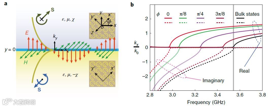 图4. a,两媒质边界上的自旋抵消与线性极化边界态;b,自旋抵消调节与边界态的色散调控。