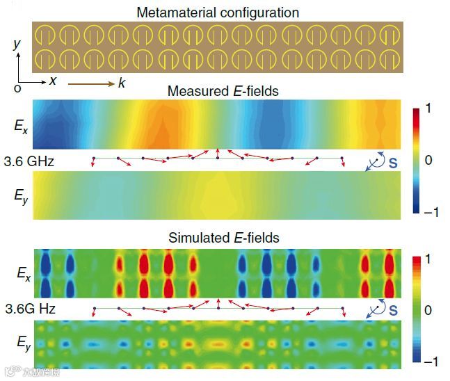 作为直接实验验证,研究团队运用平面开口环(SRR)制备了具有磁电耦合特性的电磁超构材料(metamaterial),其磁电耦合性存在于磁场的Z分量(Hz)和电场的X分量(Ex)之间,见图2。为简单起见,实验中的电磁波传播沿x方向。研究者通过对电磁波近场扫描的方式,在超构材料表面获取了沿平面切向的电场分布,观测到在超构材料中的电磁波体态的横向电场分量(Ey)和纵向电场分量(Ex)之间的90度的相位差,直接证明了垂直于电磁波传播方向的自旋(Sz)的存在。实验结果与仿真的宏观场分布基本一致,体现出沿平面法向(Z向)的自旋属性。