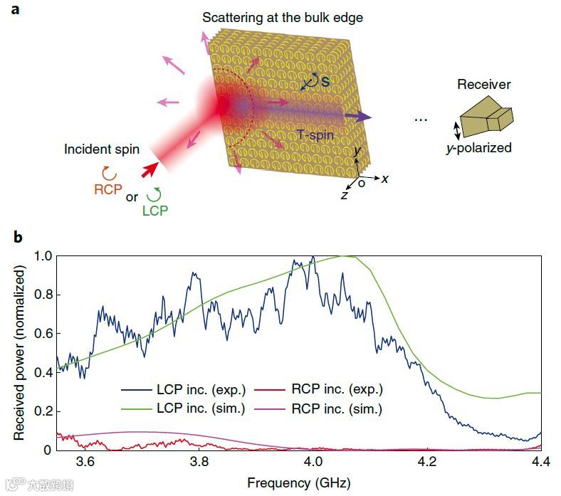 研究团队又进一步验证了横向自旋光子体态的自旋动量锁定特性,见图3所示。在实验中,研究团队采用具有不同手性旋向(LCP/RCP)的自由空间光子态(其自旋角动量沿波传播方向)照射至有限大小的超构材料体块边缘,利用边缘上的散射效应激发出在超构材料中沿X方向传播的体态。针对不同自旋属性的入射波,该超构材料块体现了高度选择性的散射效应。测量结果显示,由于自旋匹配因素,左旋圆极化的入射波可被有效地散射到超构材料体块内部,而右旋圆极化入射波则很难通过散射进入该体块。