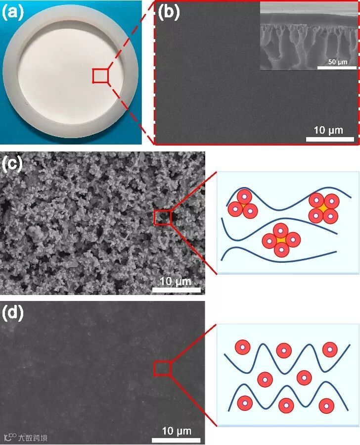 图2.(a)MA-PDMS膜表面照片,(b)MA-PDMS膜表面的扫描电子显微镜图,(c)silicalite-1/CT-PDMS膜表面的扫描电子显微镜图,(d)silicalite-1/MA-PDMS膜表面的扫描电子显微镜图。