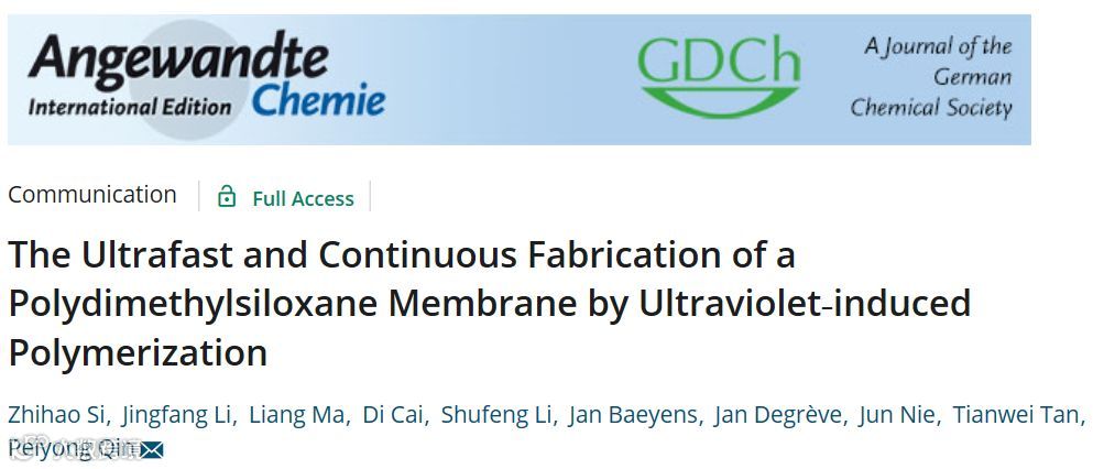 由于全球变暖和石油供应的隐患,以及能源安全问题,使得人们对可再生生物质能源的关注和研究日益增加。生物丁醇被认为是最具代表性和有效的化石能源替代品,因为相比于乙醇,丁醇的热值更高、稳定性更强、能与汽油以任意比混合。通过生物发酵法高效生产生物丁醇的关键在于下游渗透汽化工艺,该工艺往往需要大量高性能渗透汽化膜。聚二甲基硅氧烷(PDMS)膜具有较高的稳定性和选择性,是当前使用最广的渗透汽化膜。然而,使用传统的热交联方法大规模工业化制备PDMS膜目前仍是非常困难的,主要存在以下限制发展的三个关键问题:(1)固化速度极慢。传统的热交联过程往往超过180min,使得铸膜液在涂布后无法快速固化,从而导致无法连续收卷;(2)交联反应不可控。铸膜液在加入催化剂后,粘度会一直增加甚至形成凝胶,无法保证铸膜液在料液槽内的流动性,阻碍连续涂布操作;(3)高污染。通常使用大量有机溶剂溶解聚合物材料,不仅增加了操作难度和生产成本,而且危害工作人员和环境。此外,高性能有机-无机混合基质膜(MMM)的发展面临的最大瓶颈问题是无机多孔颗粒在聚合物选择层的团聚,从而导致负载量较低(通常低于30%)。