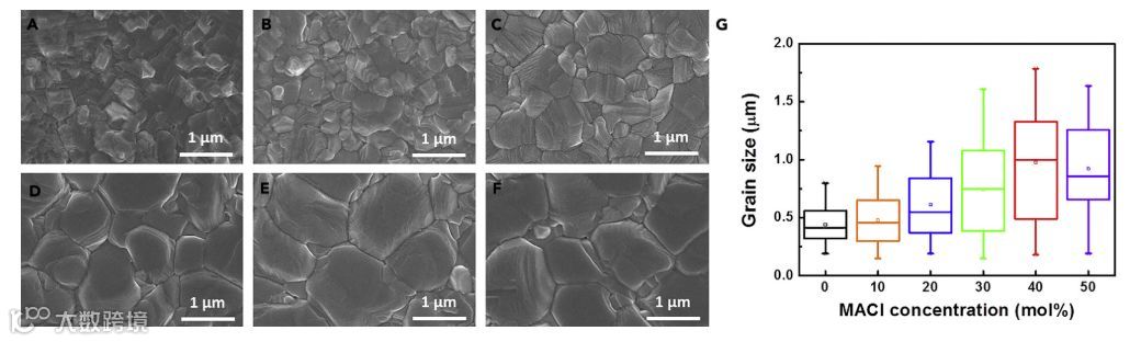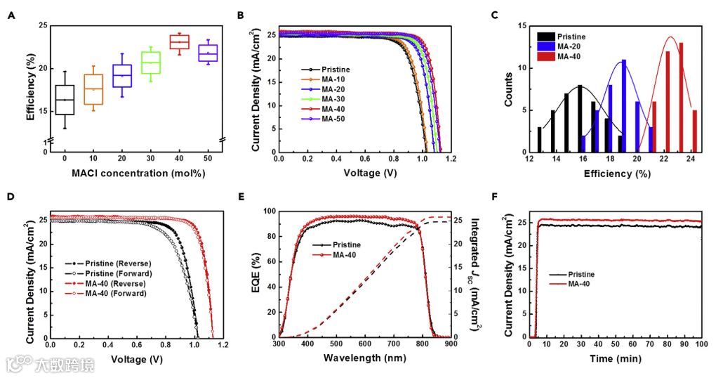 研究发现,钙钛矿薄膜的晶粒尺寸与掺入的MACl的量直接相关。图1A显示了采用不同添加量的MACl制备的薄膜SEM图(40mol%表示为MA-40)。在没有添加剂的情况下晶粒尺寸约为250 nm。MACl的引入会增大钙钛矿晶粒,MA-40的粒尺寸进一步增加到1,500 nm。晶粒统计也表明,晶粒尺寸随MACl量的增加而增加。同时,当MACl含量增加,膜的粗糙度降低。为了检查用MA离子和阴离子位点用Cl离子取代阳离子位点,使用XPS对钙钛矿薄膜进行元素表征。随着MACl含量,N峰的强度降低,表明MA离子在阳离子位点取代FA。与N离子相反,Cl离子未被取代为阴离子位点。在所有样品中未检测Cl信号,表明了Cl在退火过程中蒸发。MACl易于分解成MA离子和FACl,通过蒸发退火可以很容易地从膜中去除。