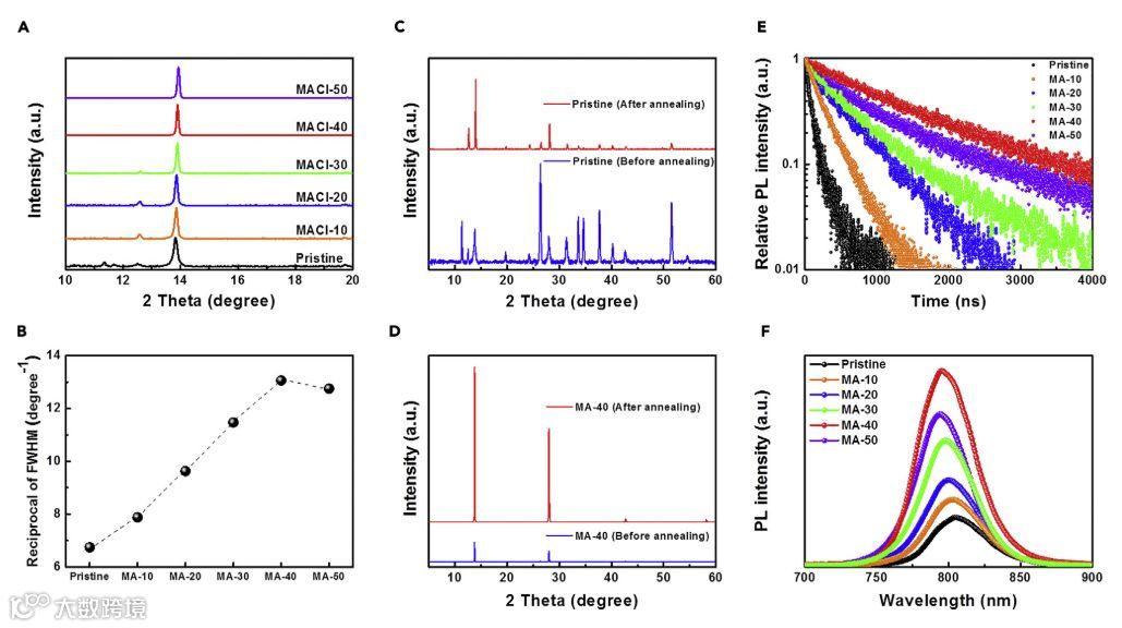 氯化物添加剂,常常被用作改善钙钛矿薄膜的质量。已有诸多研究表明,FACl和MACl是通过形成中间体混合物来增加α-FAPbI3结晶的良好添加剂,其抑制了δ-相FAPbI3的结晶;MACl可以辅助FA钙钛矿薄膜的垂直再结晶;MACl是一种过渡性“稳定剂”,保留了晶体结构并形成了α-FAPbI3钙钛矿;DMSO和MACl添加剂的协同作用,有助于钙钛矿结晶,提高钙钛矿太阳能电池的性能。然而,尚不清楚为什么MACl添加剂会比其他添加剂更好和内在的作用机理。