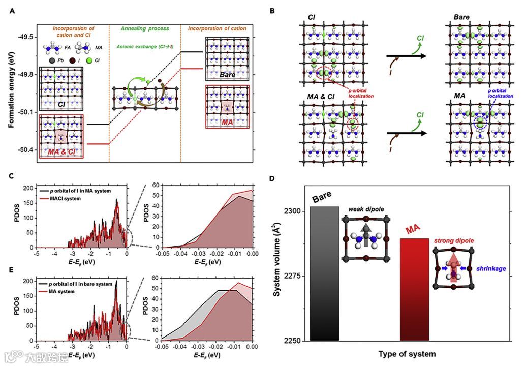 第一,为了理解Cl对钙钛矿晶体结构的作用,从模型系统计算了α-FAPbI3钙钛矿结构的形成能和包括Cl,MA或MACl的形成能。形成能显示,与不含Cl的体系相比,Cl在热力学上稳定了钙钛矿结构。因此,通过Cl可以增强FA和I的相互作用,这有助于改善FAPbI3钙钛矿结构的稳定性。