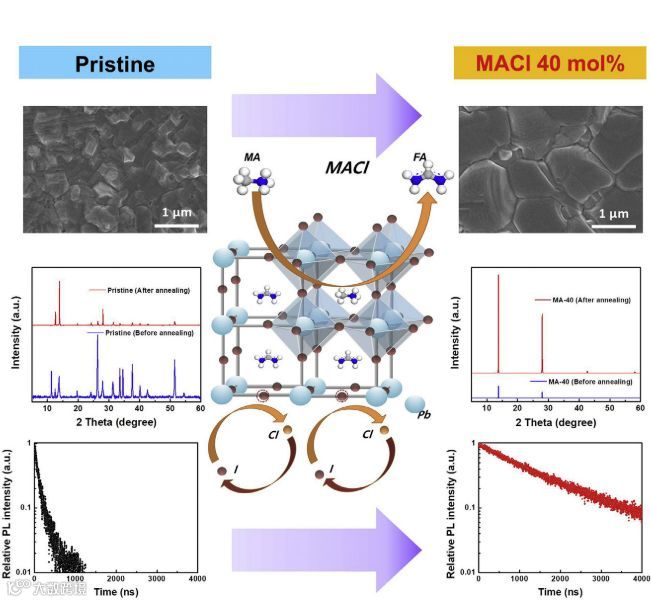 1. 甲基氯化铵(MACl)改善钙钛矿薄膜质量,α相的稳定性得到大幅度提高。
