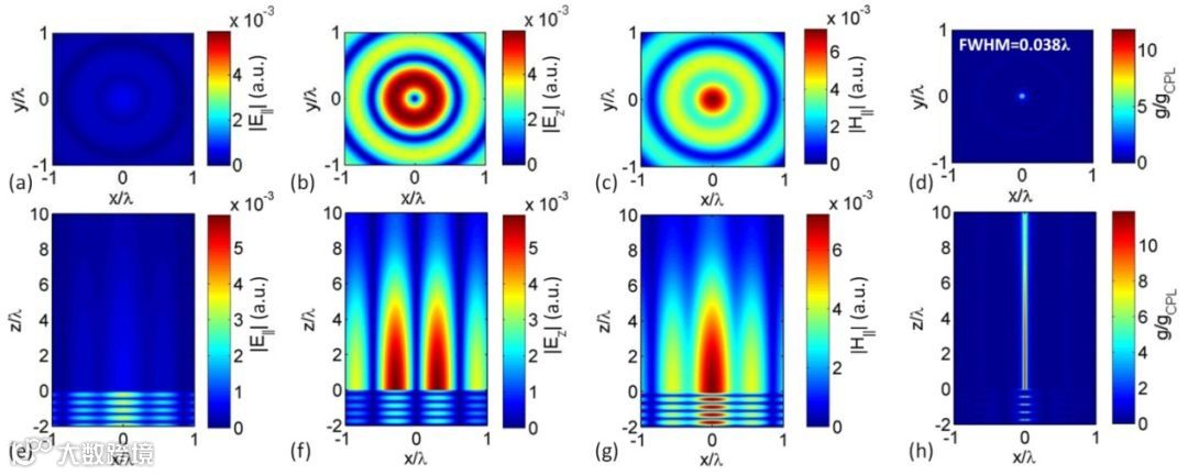 图3 (a-d)焦平面上电磁场各个分量的振幅分布,以及手性信号增强因子的分布,超手性光场具有高度局域化的特性,直径约为波长的1/25,光场手性为圆偏振光的11.9倍。(e-h)X-Z平面上电磁场各个分量的振幅分布,以及手性信号增强因子的分布,可见聚焦光场具有近似于无衍射贝塞尔光束的特性。