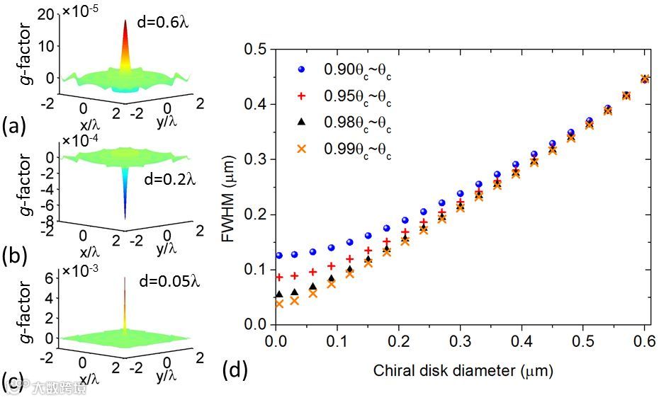 图4 (a-c) 利用超手性光束对直径为600nm,200nm和50nm的手性圆盘结构进行扫描实现圆偏二色成像。其中,200nm圆盘结构手性与600nm和50nm的结构手性相反。(d) 手性圆盘结构直径与圆偏二色成像结果半高全宽之间的关系。