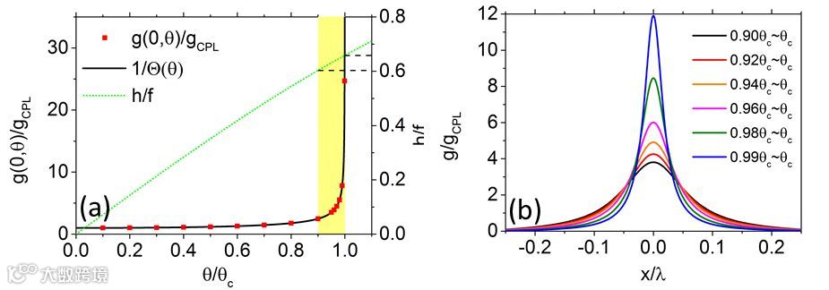图2 (a) 在焦点处,圆偏二色信号因子增强倍数与聚焦光线入射角之间的关系(如黑色实线所示),绿色虚线表示正弦条件h=fsinθ,利用该条件可以实现环形滤波器的结构设计。(b)通过环形滤波器实现不同入射角度范围的选择,利用矢量衍射理论计算得到不同入射角度范围条件下,圆偏二色信号因子增强倍数的分布。