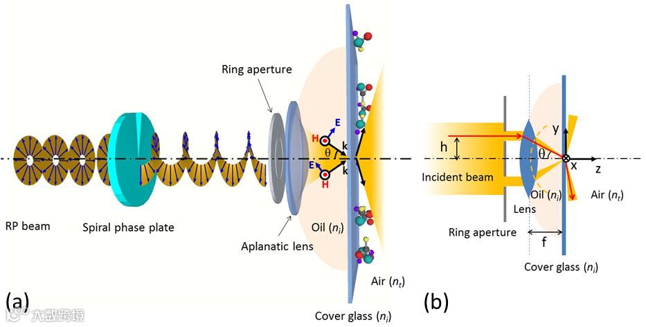 图1 (a) 通过螺旋相位的径向偏振光束产生超手性光场的强聚焦系统。(b) 焦点附近电磁场理论计算模型,其中f是透镜焦距,h为入射光线中心偏移量。