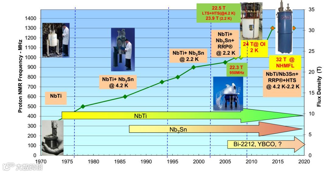 2017年,美国强磁场宣布他们制造的全超导磁体磁场强度成功达到32T(其中低温超导产生15T磁场,高温超导产生17T磁场)。2019年,他们更进一步,在31.1T水冷磁体背景磁体中插入14.4T高温超导内插线圈,在线圈的中心产生了45.5T的磁场强度,创造了稳态强磁场新的世界纪录,展现了高温超导磁体发展的美好前景。