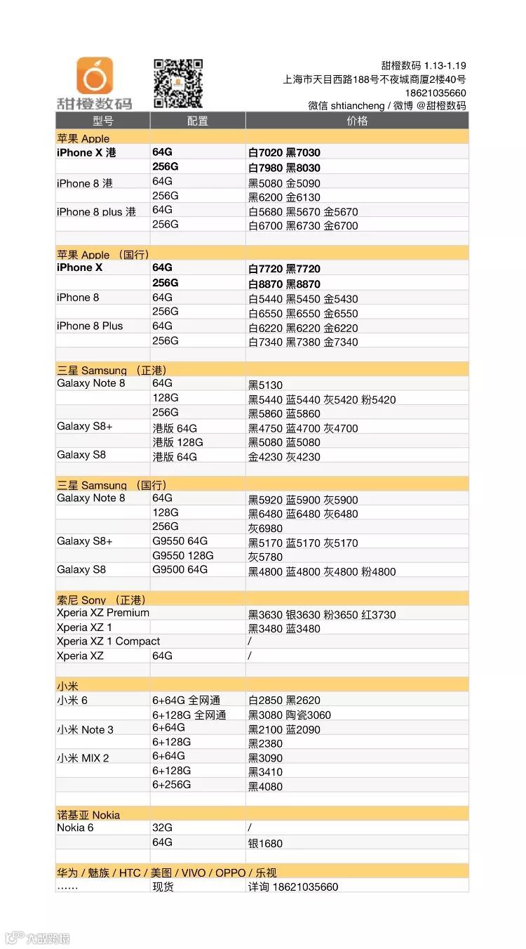 iPhone X 国行版价格稳定,港版小幅走低,iPhone 8 及 plus 小幅降价;三星 Galaxy Note 8 走低 50 元左右,港版降幅大于国行版,S8/S8+ 降幅 2、30 元;索尼 Xperia XZ Premium 下浮 20 元;小米各款手机价格大部稳定。
