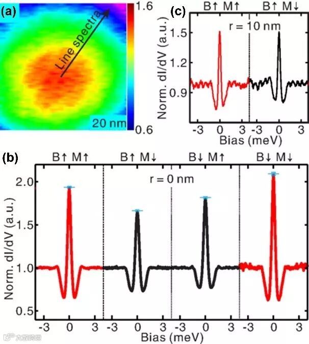 图1 (a) 拓扑超导体5QL Bi2Te3/NbSe2在0.1 T外加磁场下磁通涡旋的零偏压dI/dV映射图;(b) 在磁通涡旋中心用自旋极化的针尖测得的dI/dV谱;(c) 在离磁通涡旋中心10 nm远的地方用自旋极化的针尖测得的dI/dV谱;只有在Majorana束缚态存在的区域,dI/dV谱零偏压电导峰强度才与磁场方向有明显的依赖关系,这是Majorana束缚态存在的一个有力证据。