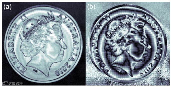 图2 (a) 硬币实物图 (b) 成像效果图