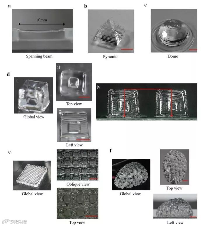近日,来自浙江大学的Zhe Chen等研究人员发现了一种打印多功能性水凝胶的方式。研究人员在水凝胶中加入一种卡波姆(Carbomer)的流变修饰剂,这种修饰剂与水凝胶有着很好的相容性,只需要很小的剂量(0.5% w/v)就可以多功能水凝胶的打印。由于修饰剂的剂量很小,所以水凝胶本身的功能性得以保持。研究人员打印测试了多种结构发现,用这种加入卡波姆的水凝胶打印的结构,可以自我支撑,并且能够在后聚合前数个小时内不变形。研究发现,随着卡波姆含量的增加,打印结构的力学性质有着显著的增强,这是由于卡波姆链和水凝胶链发生纠缠,从而增加整个结构的力学性能。另外,卡波姆和很多水凝胶有着很好的兼容性,所以配合不同功能的水凝胶实现多功能打印,例如和韧性水凝胶打印出高韧性结构,配合对外界刺激有反应的水凝胶实现4D打印,甚至可以通过加入磁性颗粒实现结构的远程控制。同时,卡波姆有着很好的生物相容性,低浓度的卡波姆含量意味着水凝胶中有着高含量的水,而水又是细胞活动必要的介质,所以这种水凝胶在生物医学领域有着潜在的应用。