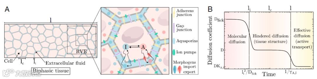 Fig:活跃的两相组织模式形成模型。(A)模型示意图。(左)细胞形成一个多孔弹性网络,由细胞外液渗透,其中可以定义三个自然长度尺度:间隙大小(li)、特征细胞大小(lc)和组织大小(l)。(右)形态原A和I之间的生物化学相互作用发生在细胞内,并由它们各自的转化率函数用f(a,i) 和g(a,i) 来描述。A和I分别以lA,I和lA,I的速率通过细胞膜进入流出细胞。在细胞外空间中,A和I都以相同的速率扩散,或以同样的速率被流体平流。(B)有效扩散系数随时间和空间的尺度而变化。在较短的距离和时间内,用分子扩散系数Dfick描述了形态原的扩散行为。在中等尺度上,形态原的扩散运动开始受到细胞的阻碍,整体扩散系数d依赖于组织的空间组织。在更大的范围内,形态原扩散速率由与细胞的相互作用(导入/导出、吸附/沉析)和有效系数DKA,I动态控制。