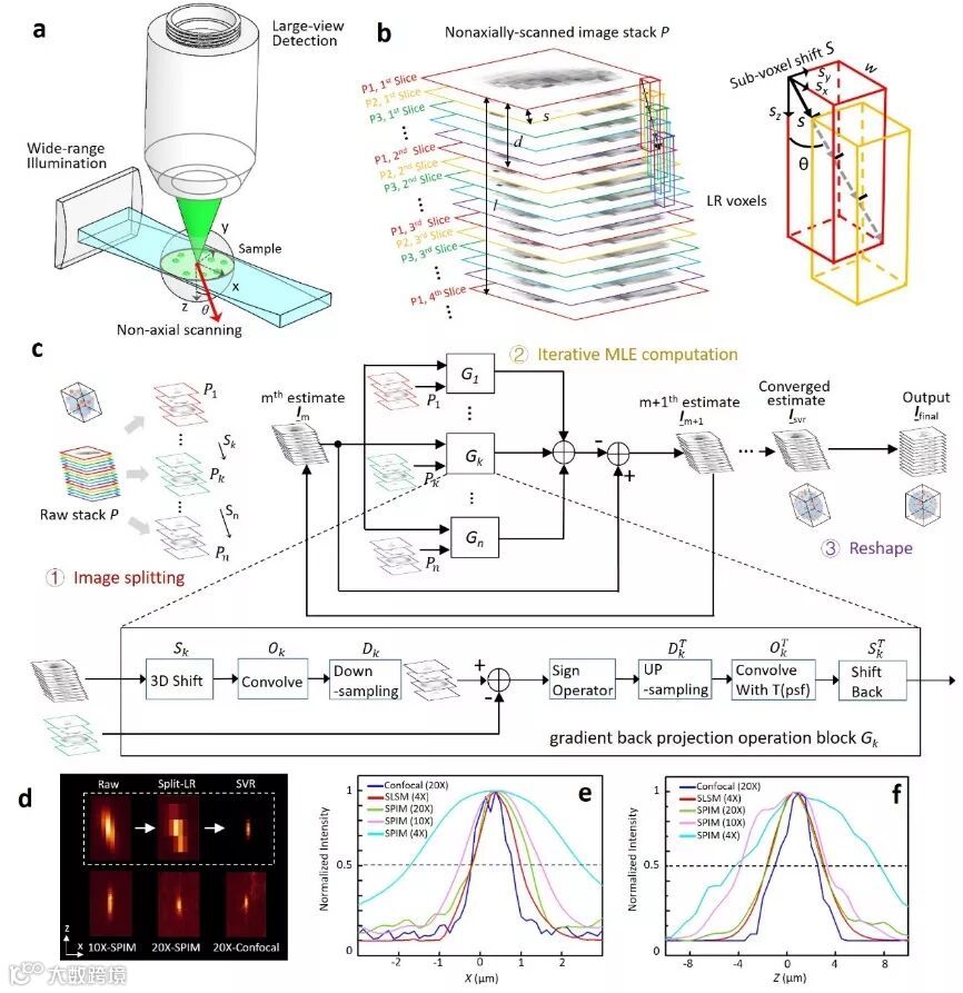 如图1所示,该方法与传统的轴向扫描不同,采用一种斜轴扫描方式。这种独特的扫描方式可以在x, y, z三个方向上产生位移分量。通过合理设计斜轴角度和扫描步长,可以在三个维度产生亚像素的位移。首先对获得的低分辨图像堆栈P进行分组,得到多组具有亚体像素位移的低分辨三维图像堆栈(P1,…,Pn)。然后将多组低分辨三维图像堆栈作为输入,利用极大似然估计(MLE)迭代重建恢复出高分辨的图像I_svr。最后将斜轴扫描引起的倾斜进行校正。利用这种亚体素超分辨(SVR)方法可以将三维图像的横向分辨率提升3~4倍,轴向提升2~3倍。这种扫描和算法的独特结合称为亚体素光片显微镜(SLSM)。该方法可以用图型处理器(GPU)进行加速计算,进一步提高运算速度。