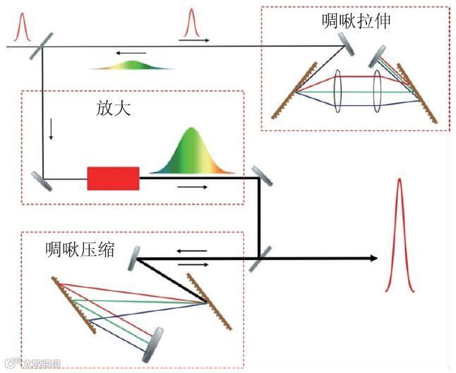 图5 啁啾脉冲技术产生超强超短激光脉冲示意图。短脉冲经过啁啾拉伸双光栅后,低频光(红光)由于光学路径较短比高频光(蓝光)先出来,形成一个被啁啾拉伸的长脉冲;长脉冲放大后,再被啁啾压缩成高峰值功率的短脉冲