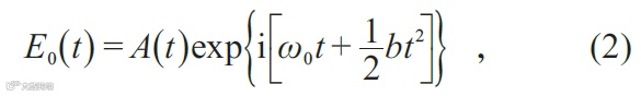 其中 A(t)是脉冲的振幅函数,ω0t 是无啁啾相位函数, (1/2)bt2 是线性啁啾的相位函数。频率ω(t) =ω0 + bt 随时间线性变化。