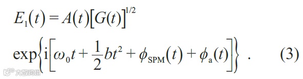 与(2)式相比,激光场的振幅和相位均被增益介质调制。其中G(t) 是功率增益,它实际上是频率的函数,通过随时间变化的频率对时间依赖。ϕSPM(t) 是自相位调制(SPM,self phase modulation),它与之前提到过的自聚焦效应均来源于随激光强度而变化的介质折射率。ϕa(t) 是介质响应引入的额外相位。由于篇幅限制,我们将不在这里给出这两个相位的具体表达式。注意引入这两个相位后,激光的频率也变得更为复杂,是 所 有相位的和对时间的导数,即 ω(t) =ω0 + bt + ϕ'SPM(t) + ϕ'a(t),而这个频率又实时反馈到功率增益G(t)中。在这里我们强调放大后的脉冲形状(振幅函数)为 A(t)[G(t)]1/2 ,与放大前的脉冲形状 A(t)相比发生了变化。