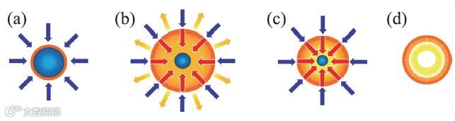 图7 是一个惯性约束核聚变示意图。将多束强激光(直接驱动方法)或者强激光打在环空器(hohlraum)后的次级X射线辐射场(间接驱动方法)从各个方向打在氘氚混合的球形核燃料靶丸上(靶丸直径在毫米量级)。靶丸的表面涂层被快速加热形成等离子体,并迅速向外爆裂;其反冲作用通过惯性机制向内压缩氘氚燃料核,形成高温高压的极端物质状态, 诱发氘氚核聚变反应[D+ T→He + n + 17.6MeV]。