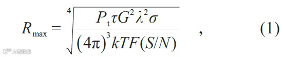 其中Pt 是发射功率, τ 是脉冲持续时间(反比于频率带宽), G 是天线增益, λ 是波长, σ 是目标截面积, k 是玻尔兹曼常数, T 是温度, F 是接收器噪声放大因子, S/N是最小可探测信噪比。由(1)式可见,雷达的探测范围正比于发射脉冲的总能量Pt τ 的4次根。