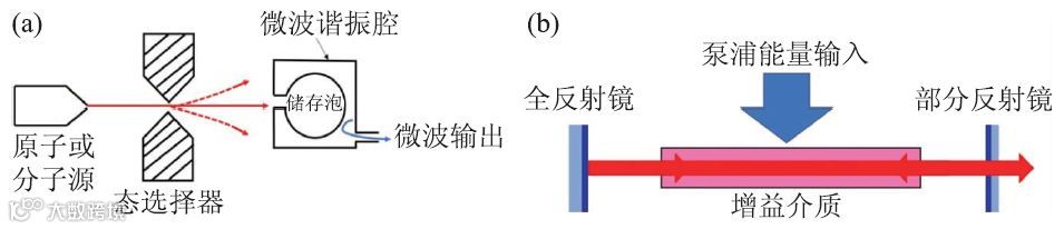 微波激射器的原理如图2(a)所示。原子或分子源产生部分激发的气体原子或分子,通过态选择器(比如类似于斯特恩—盖拉赫实验中的磁铁)将处于激发态的原子或分子导入储存泡(原子或分子可以在其内壁多次反射而不改变量子态)。储存泡本身则置于微波谐振腔内。通过受激辐射过程,激发态的原子分子跃迁至基态,放大相应频率的微波;微波谐振腔则对这个过程正向反馈,不断放大微波信号。汤斯和肖洛(A. L. Schawlow)随后提出了激光(laser, light amplification by stimulated emission of radiation)的原理,将微波激射器产生和放大微波的机制应用到可见光频率范围[7]。和封闭的微波谐振腔不同,激光谐振腔是开放的一维谐振腔,如图2(b)所示。1960 年梅曼(T. H. Maiman)制造了第一台激光[8],以红宝石晶体作为增益介质。随后基于不同增益介质、具有不同特性的激光相继出现。汤斯、巴索夫(N. G. Basov)和普罗霍罗夫(A. M. Prokhorov)因为在微波激射器和激光方面的贡献获得1964年诺贝尔物理学奖。
