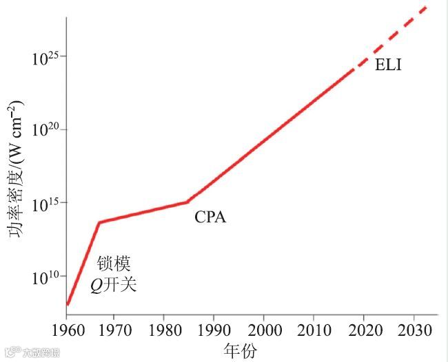 图6 激光强度(聚焦功率密度)随年份的进展。1985 年CPA技术出现后激光强度快速提升。欧洲极端光源设施(ELI)预计在未来数年达到1023—1024 W/cm2量级强度