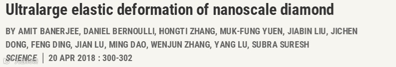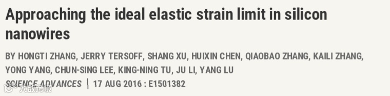 Subra Suresh、Ming Dao和Yang Lu进行的最新研究表明[1],即使是自然界中最坚硬的金刚石,当其以纳米级(~300纳米)针尖形状存在时,单晶金刚石的最大拉伸应变可高达9%(接近理论弹性极限),相应的最大拉伸应力达到89~98千兆帕。Ju Li和Yang Lu[2]的工作同样证明了室温下气-液-固法制备直径约100nm的单晶硅纳米线,可反复拉伸实现10%以上的弹性应变,接近硅的理论弹性极限(17~20%)。