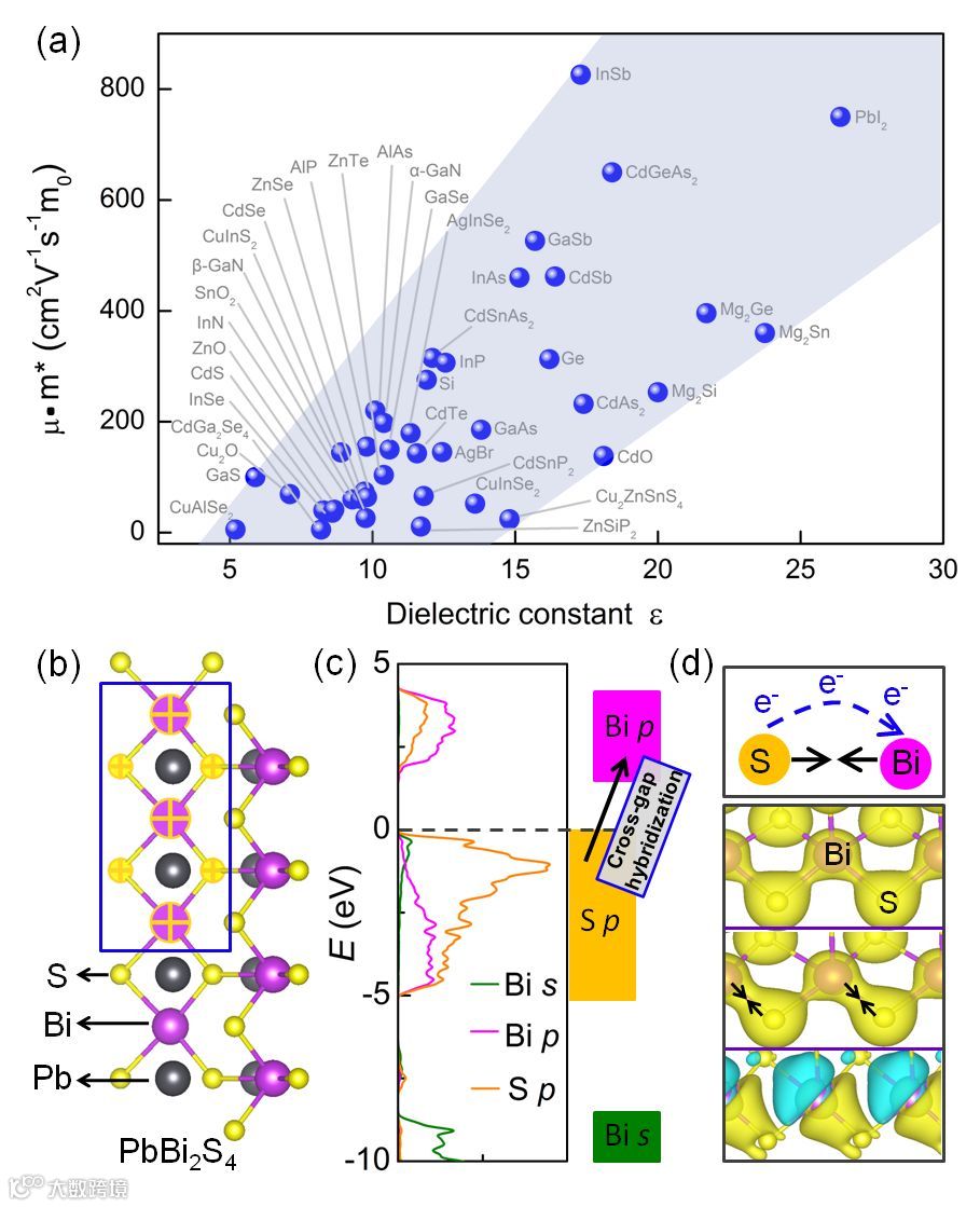 图一(a)显示半导体材料的载流子输运性质性质与介电常数之间存在内在的联系。课题组选择三元金属-V族元素-硫化物体系开展研究的理论依据是:该体系中Sb/Bi的p轨道与S的p轨道间有显著的跨带隙杂化,使得玻恩有效电荷增加,从而使这类材料具有高的介电常数(晶格贡献部分)。以典型的三元金属-V族元素-硫化物材料PbBi2S4为例,(b)图是其晶体结构,(c)图的分波态密度呈现Bi-p和S-p轨道间显著的跨带隙杂化。(d)图Bi和S原子靠近,杂化增强导致电荷转移的示意图,表明该体系具有高的玻恩有效电荷,从而具有高的介电常数。