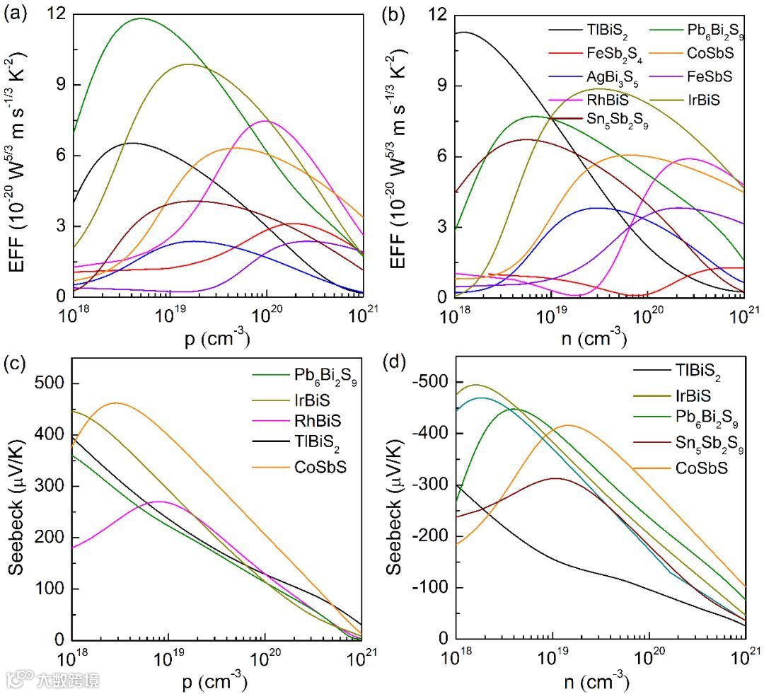 Figure 4. (a, b) Calculated electronic fitness function (EFF) at 800 K with respectto the carrier concentration of p-type and n-type compounds that have big electric constant and Eg < 1. (c, d) Calculated Seebeck coefficient of the five best compounds from the point of view of EFF for p-type and n-type.